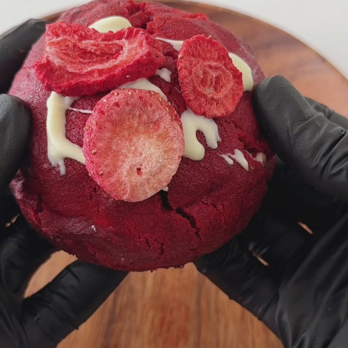 Strawberry Velvet Cookie - an elegant strawberry-infused cookie made with premium Belgian ruby chocolate, featuring a soft, velvety crumb. Delicately aromatic, tender, and refined — a truly romantic dessert experience.