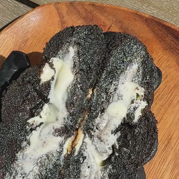 A rich black cocoa cookie layered with creamy white Belgian chocolate and crunchy chocolate sandwich cookie pieces, finished with a soft, melty white chocolate center studded with cookie chunks for a bold and indulgent contrast of flavor and texture.